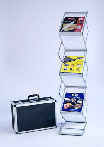 The EZ Frost features 6 shelves for displaying literature with easy set up. The frosted shelves provide a clean and professional look. Single and double widths are available, and both sizes include a hard carrying case for easy transport.