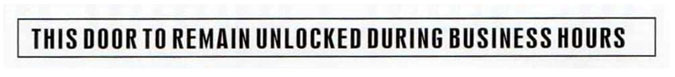 "THIS DOOR TO REMAIN UNLOCKED DURING BUSINESS HOURS"