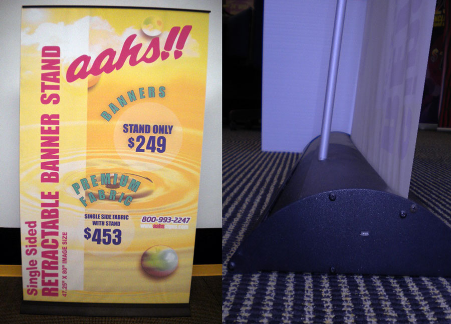 Retractable banner stand. This retractable stand can have two banners installed.